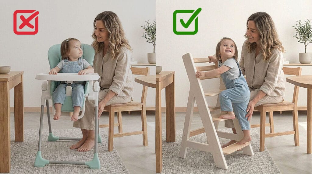 En este sentido, elementos como una silla alta evolutiva o una torre de aprendizaje no son accesorios, sino extensiones del ambiente preparado que permiten al niño participar en la vida cotidiana, moverse con libertad y actuar por sí mismo dentro de su entorno.
