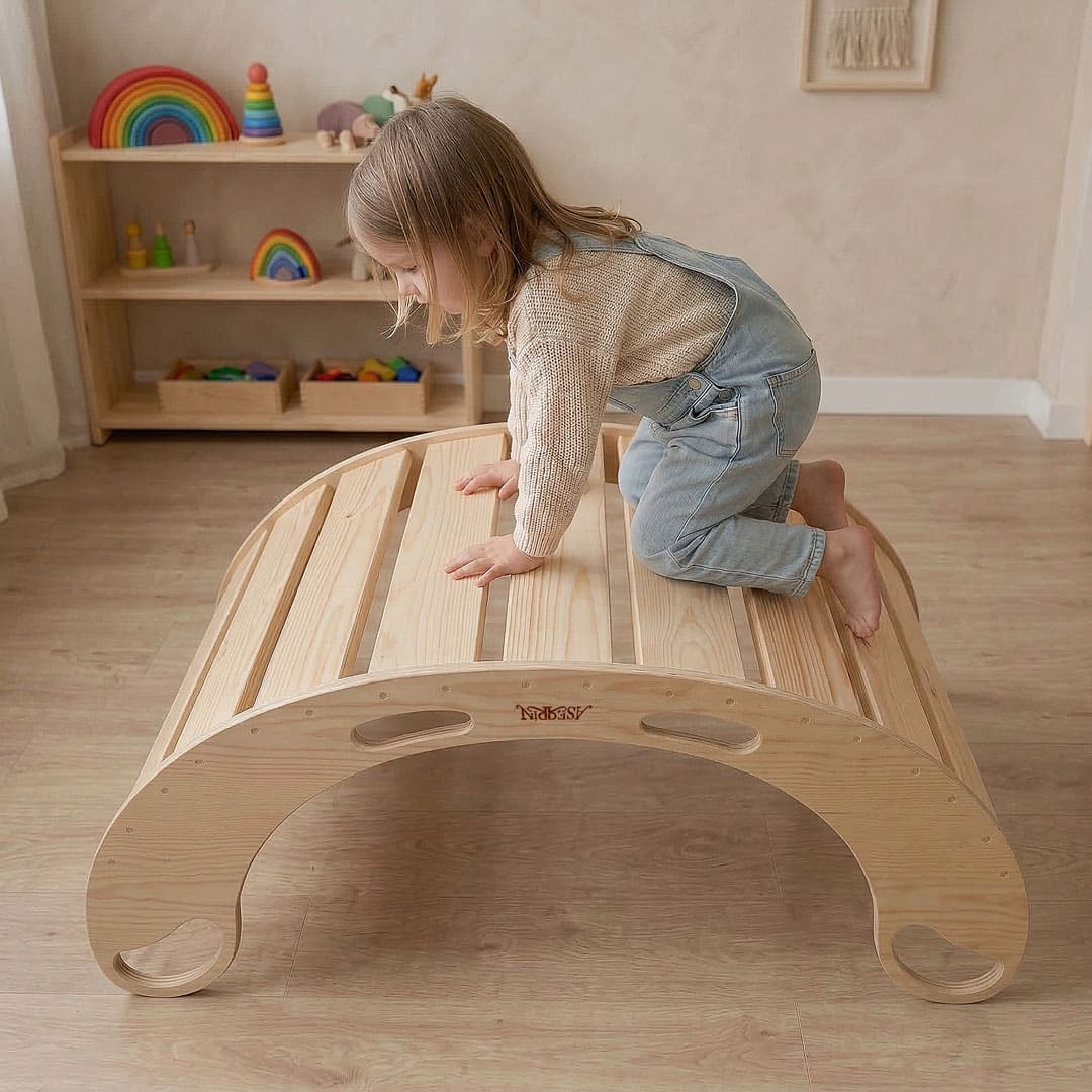 Combínalo con el Triángulo Pikler, el Arco Pikler, el Cubo Pikler o la Tabla Curva para crear un circuito de movimiento en casa.