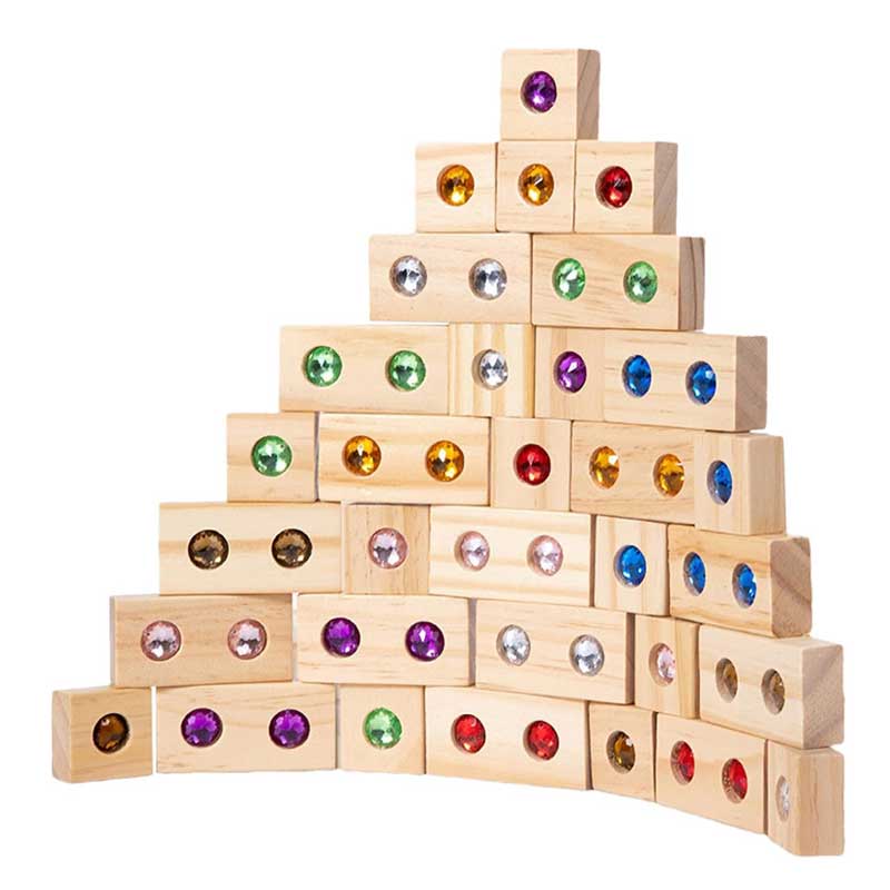 50 bloques de madera que tienen incrustaciones de gemas acrílicas de colores, fomentan la creatividad, el desarrollo de habilidades motoras finas y el reconocimiento de colores. Los bloques de gema se pueden utilizar para construir torres, castillos y otras estructuras, o simplemente para apilar y clasificar