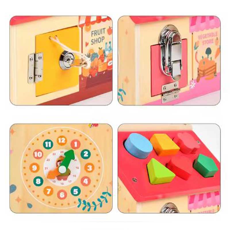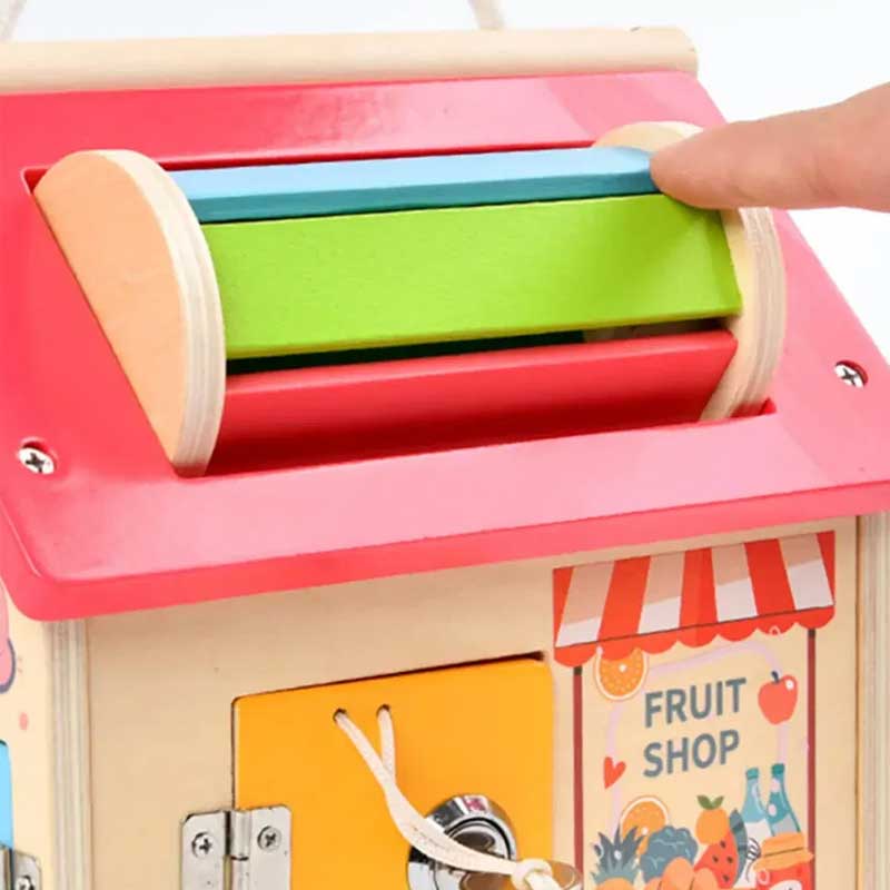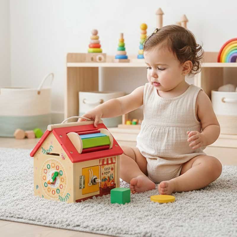 Diseñada para aprender jugando, la Casita Didáctica invita a tu bebé a explorar con todos sus sentidos — abriendo cerraduras, encajando formas y descubriendo qué hay detrás de cada puerta.
