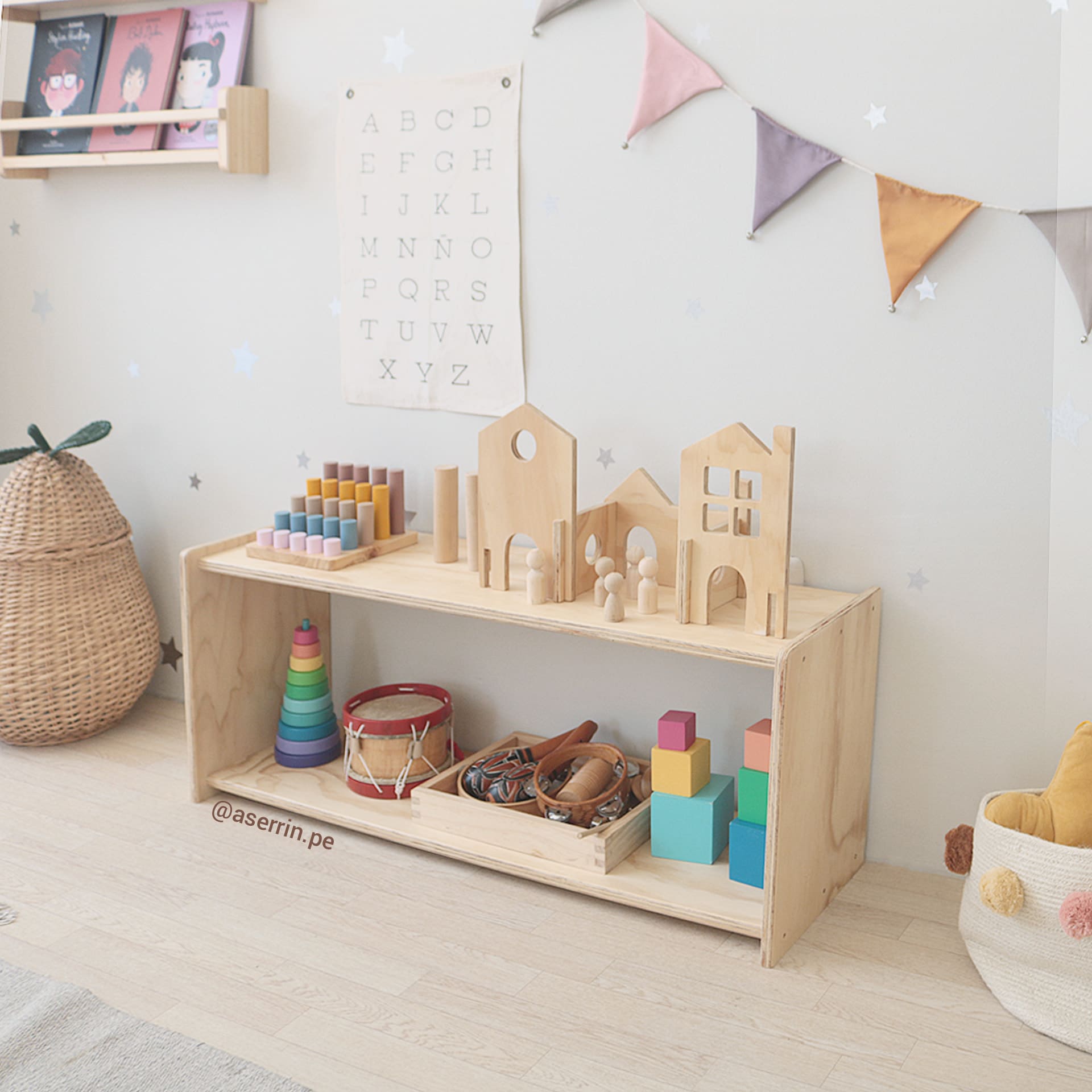 En Montessori se habla mucho de la rotación de material o juguetes, lo que hay en el estante siempre debe ser lo que tu niño necesita en su etapa. Las habilidades de tu peque avanzan y los materiales en su estante deben rotar para satisfacer esas necesidades. Como se cambian constantemente los materiales, estos pueden ser muy pequeños o muy grandes, si el estante tiene compartimientos no funcionaría siempre para guardar todos los materiales.